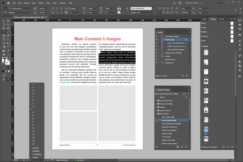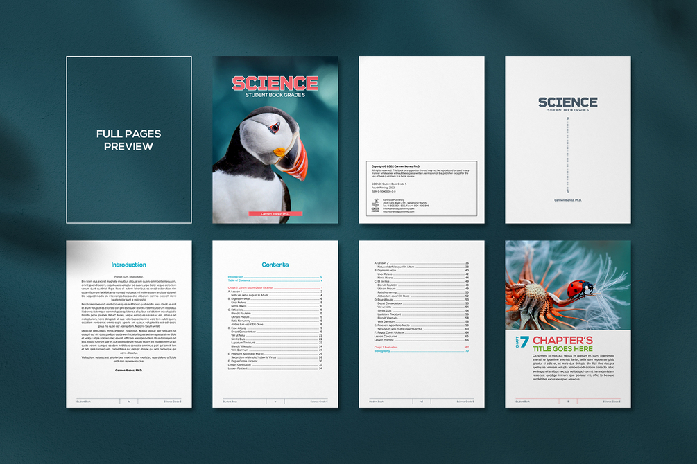This is an essential ebook template of Science Textbook for elementary school. It’s available in 1536x2048 pixels size for iPad Retina—customization only with PC/laptop on Win OS. Source files designed for professional use with Adobe InDesign 2022 in RGB color mode. This template features Dig Concept box, InFact panel, cladogram, modern pie chart, histogram, stylish table, Critical Thinking box, Posttest panel, mini tree chart, Nature Secret panel, Experiment (Lab Corner), and a fictional bibliography with standard reference lists in APA format.