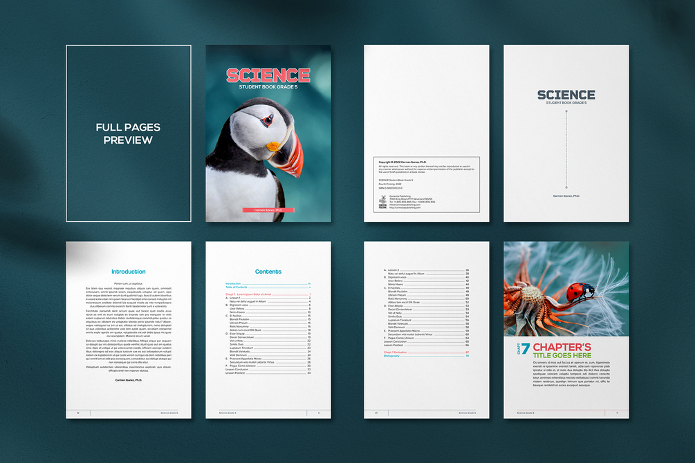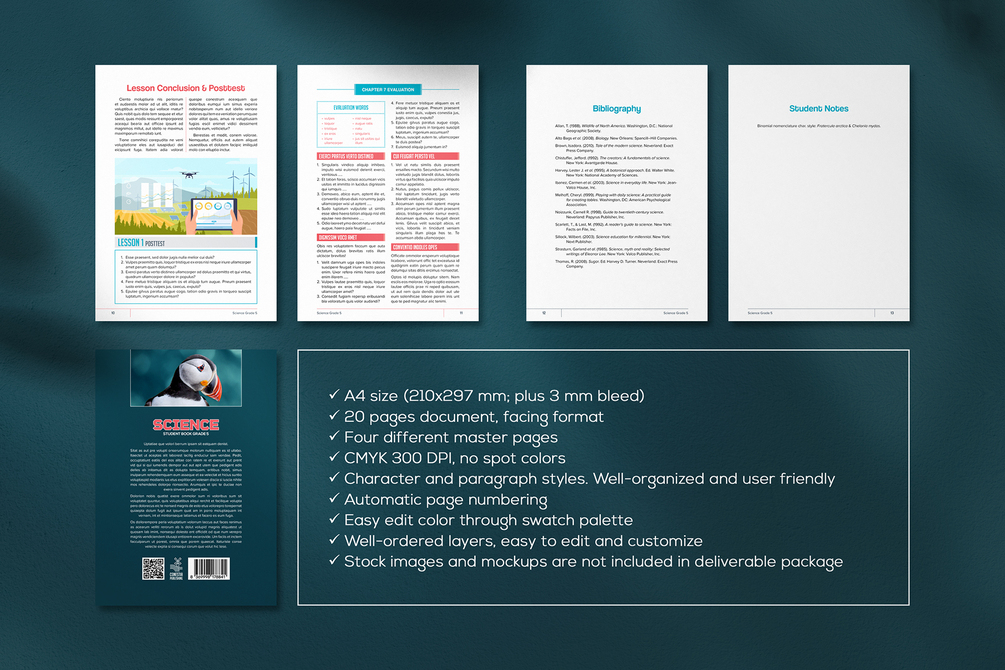 Meet an uncluttered aesthetical nice print template for professional use, Science Textbook Template 4.0. It’s a finely mouse crafted essential template for Adobe InDesign in A4 document size—other size and format sold separately. This template features Dig Concept box, InFact panel, cladogram, modern pie chart, histogram, stylish table, Critical Thinking box, Posttest panel, mini tree chart, Nature Secret panel, Experiment (Lab Corner), and a fictional bibliography with standard reference lists in APA format.